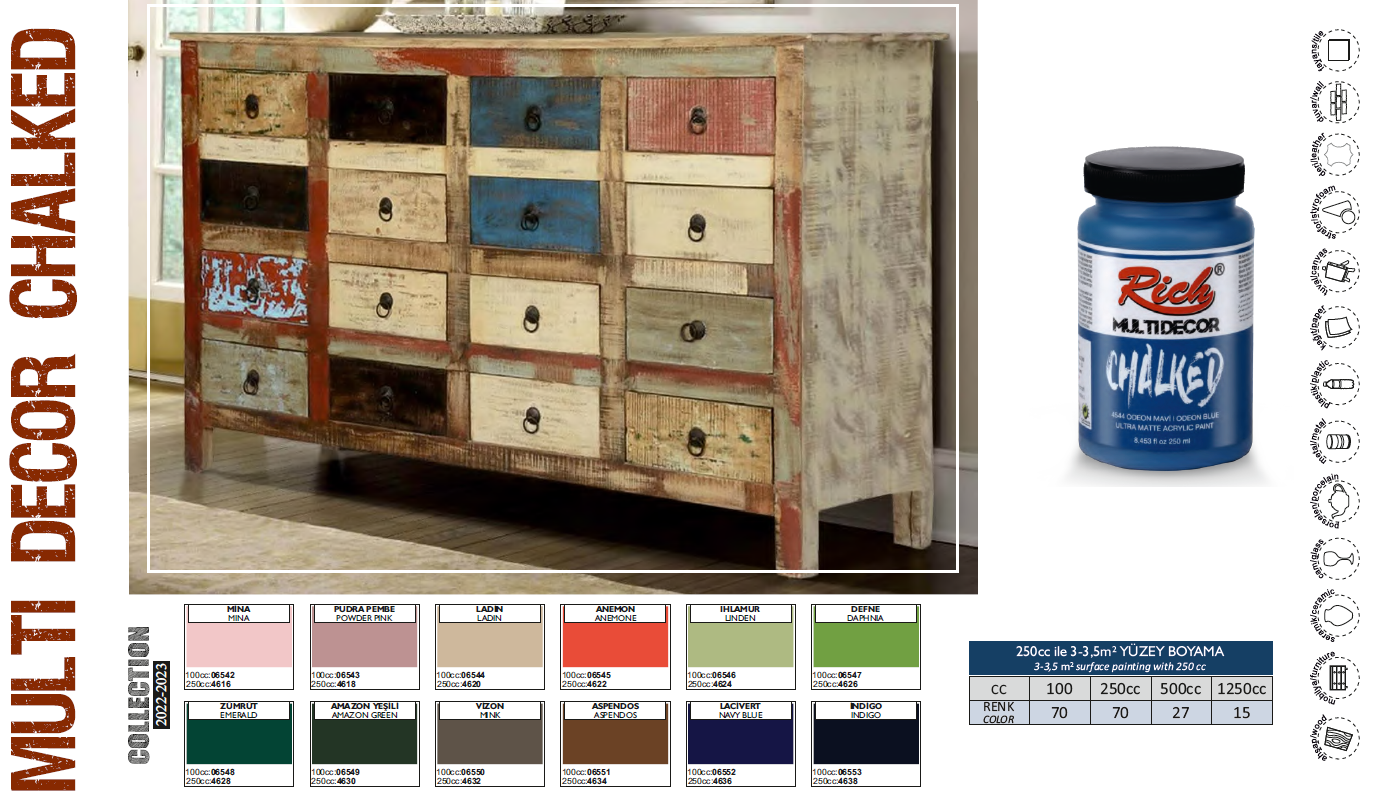 Kreide-Finish-Acrylfarben mit 70 Farben in 100, 250, 500, 1250 cc Flaschenoptionen.