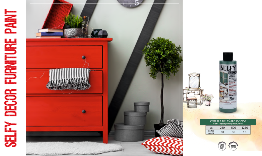 auf die aufgebrachte Oberfläche. Die Netzoptik wird je nach Untergrund nach durchschnittlich 2-3 Anstrichen erreicht. Es ist keine Verdünnung erforderlich. Es ist direkt einsatzbereit. Die Farben können untereinander gemischt werden. Es ist für den Auftrag mit Rollen und Pinseln geeignet. Beim Streichen von lackierten Oberflächen und Möbelrenovierungsprodukten mit Selfy Decor ist keine Vorbereitung oder Schleifen erforderlich. Es reicht aus, dass die zu lackierende Oberfläche sauber und trocken ist. Zwischen den Schichten muss mindestens 4-6 Stunden gewartet werden und das Produkt sollte vor jedem Gebrauch geschüttelt werden. Die vollständige Trocknungszeit für die mit Selfy Decor eingefärbte Oberfläche beträgt 4-5 Tage.