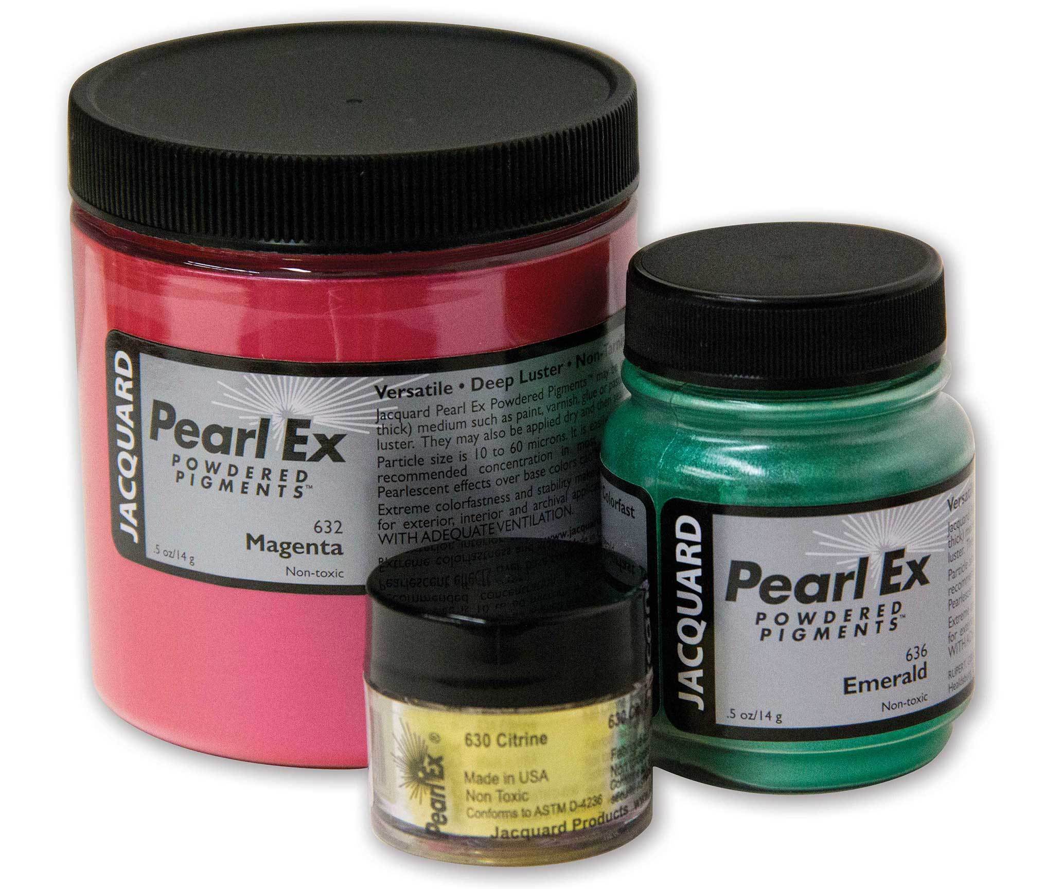 Pearl Ex Powdered Pigments are our most versatile product yet! Mix Pearl Ex into any viscous medium for a metallic/pearlescent effect. Pearl Ex is a safe, inert pigment that exhibits extreme colorfastness and stability, ideal for interior, fashion, fine arts and other archival applications. It has a use for every artist, from watercolorist to calligrapher, resin caster to rubber stamper. Try it mixed with Gum Arabic, glue or acrylic gel medium, or mixed into one of Jacquard’s colorless extenders for use on fabric. It can also be mixed with oils, acrylics, encaustics, cold waxes, polymer clays, printing inks, resins, or spread dry on porous surfaces. Pearl Ex creates a metallic effect without being a real metal—it will never tarnish or fade. The different particle sizes produce different effects, from a smooth pearly luster, to a highly metallic sheen.