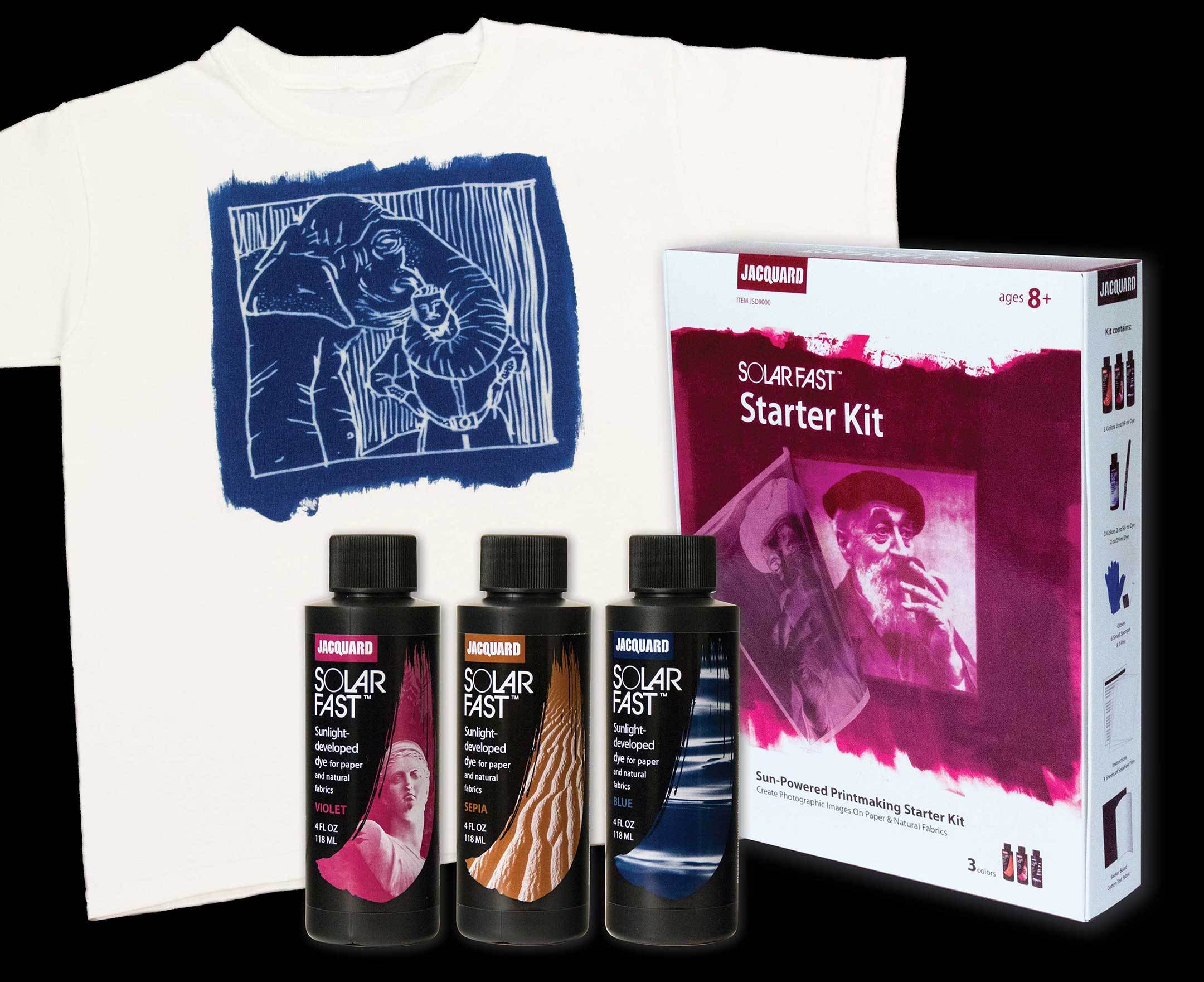 SolarFast sunlight-developed dyes are used to create photograms, photographs and sun prints on paper and fabric. Used with a hand-drawn or inkjet-printed negative, SolarFast allows you to create fully detailed photographs with a complete tonal range on a T-shirt or artist paper. SolarFast is a true dye that is also great for painting, tie dyeing, screen printing, stamping, batik and more. No heat setting, chemical or steam fixing necessary--just apply the dye and set it in sunlight (or artificial UV light) and watch the color develop! The dye is odorless and makes a great activity for children.