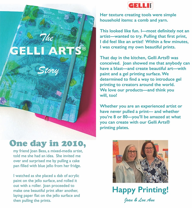 GELLI ARTS invented the first reusable, durable printing plate and began selling in 2011. We are committed to grow the printing category - through innovative new products for fine artists, art educators, crafters and students!