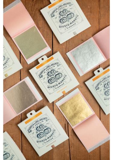 These are boxes containing a single booklet of 5 or 25 leaves, in 9 different genuine gold colours and in verying sizes (8x8 cm, 8.6x8.6 cm). Each color is supplied in its own customized packaging, thus favouring the gold hue choice.