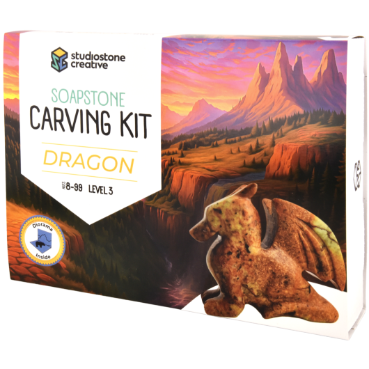 Premium quality Dragon stone carving project kit. Designed by artists to give people the thrill and expereince of shaping natural stone into a dragon sculpture. Each project is hand cut from selected stone and packaged with custom tools and finished supplies needed for the sculpture. Visual and video instructions are provided as well as online carving webinars. The project take between 90 and 120 minutes and is designed for ages 8 to 99.