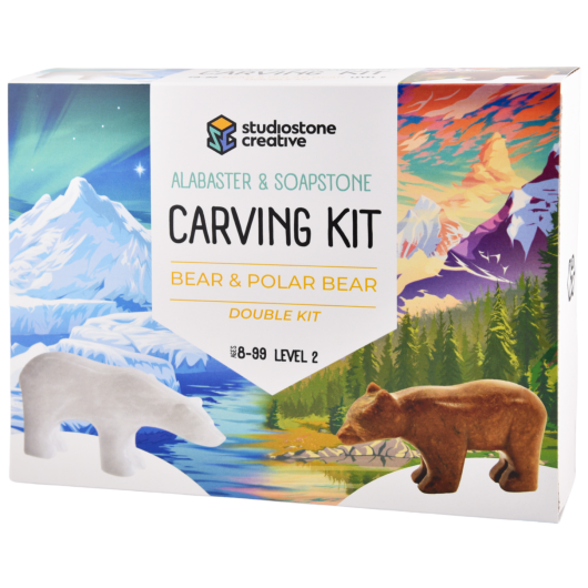 Premium quality Double Bear Spanish alabaster and Brazillian Soapstone carving project kit. Designed by artists to give people the excitement and expereince of shaping natural stone into two bear sculptures. Each project is hand cut from selected stone and packaged with custom tools and finished supplies needed for the sculpture. Visual and video instructions are provided as well as online carving webinars. The project take between 90 and 120 minutes and is designed for ages 8 to 99.