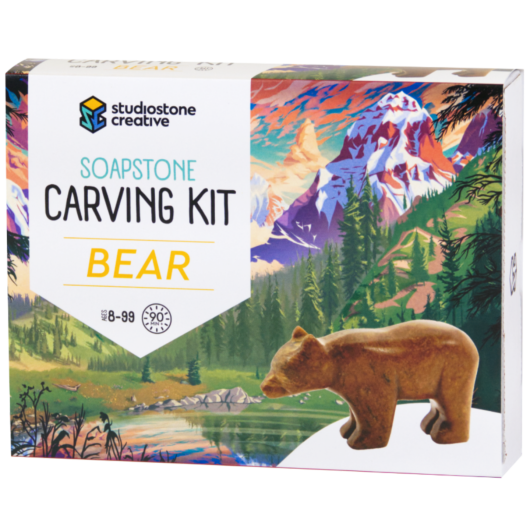 Premium quality Bear carving project kit from Brazillian Soapstone. Designed by artists to give people the excitement and expereince of shaping natural stone into a bear sculptures. Each project is hand cut from selected stone and packaged with custom tools and finished supplies needed for the sculpture. Visual and video instructions are provided as well as online carving webinars. The project take between 90 and 120 minutes and is designed for ages 8 to 99.