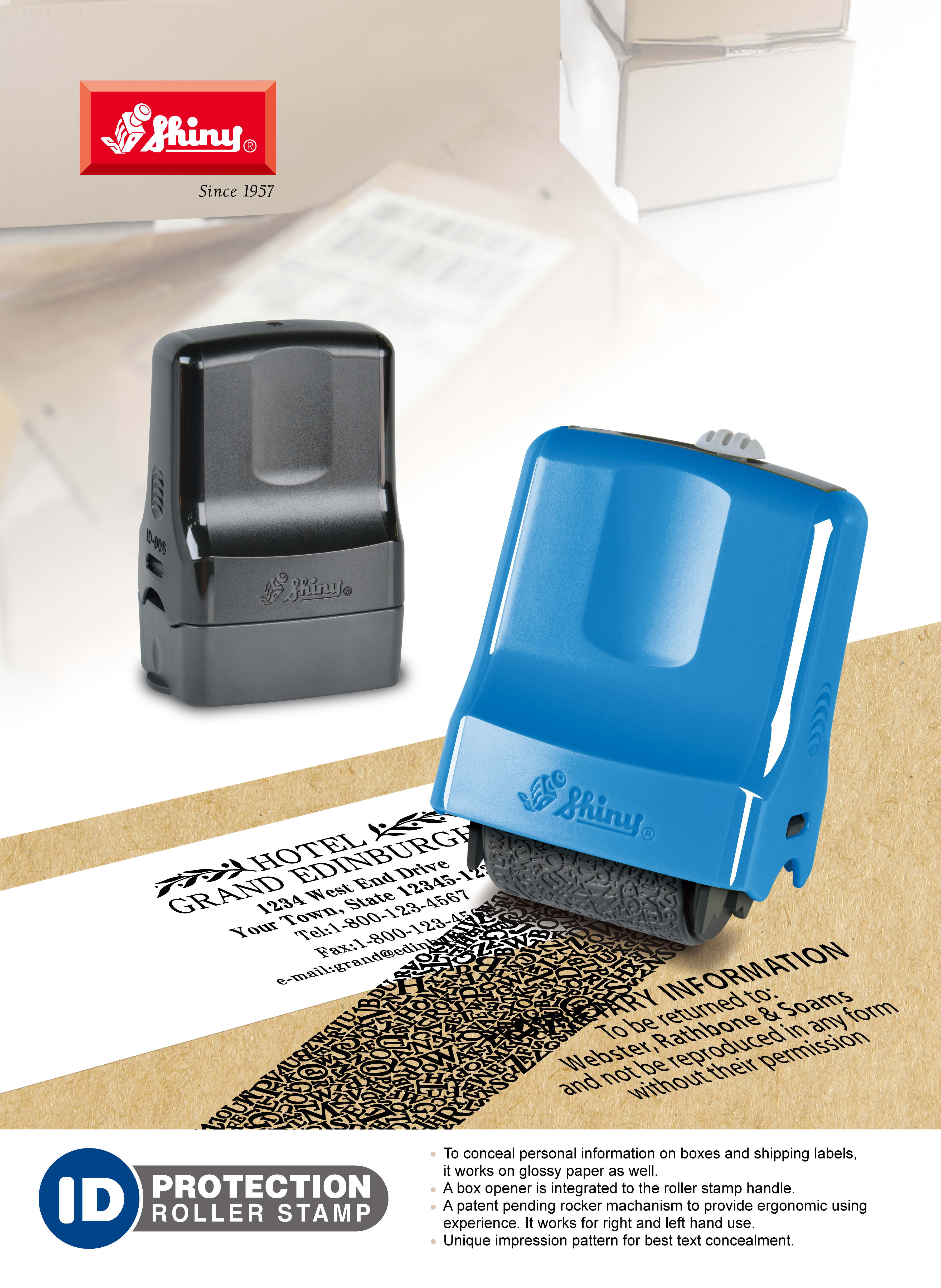Shiny ID Protection Roller Stamp was designed to conceal personal information (it may not completely conceal all data) on boxes, shipping labels, letters and envelopes. A unique rocker design on the roller mechanism provides a ergonomic operation.
